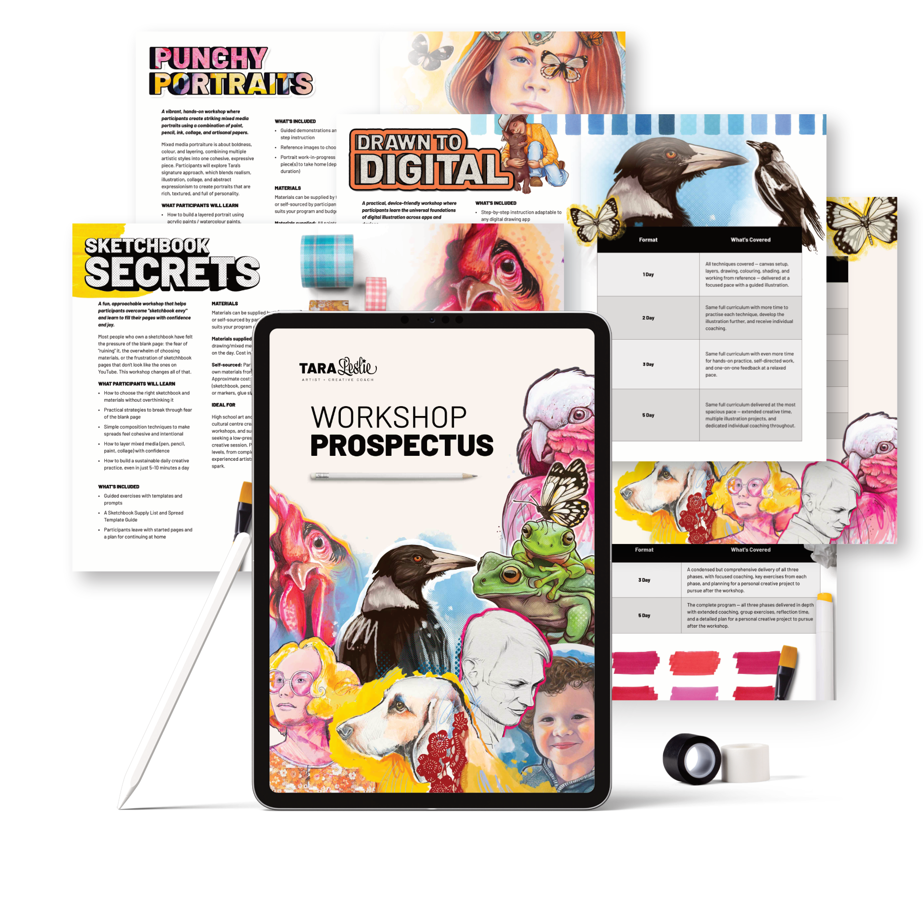 This comprehensive prospectus will step you through everything Tara offers — from ballpoint pen realism and mixed media portraiture to digital illustration and creative coaching — including formats, durations, and deliverables.
